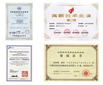 資質認證 國家級高新技術企業(yè) CMMI認證 ISO9001:2008國際質量管理體系認證 雙軟企業(yè)認證 計算機系統(tǒng)集成三級資質 國家涉密計算機信息系統(tǒng)乙級資質 寧夏回族自治區(qū)安全技術防范工程施工資格證書 |